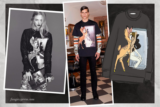 Soy 100% fan de Disney (me pueden retar a una trivia y van a salir perdiendo), así que me fascina la idea de ver a mis personajes preferidos de la infancia en playeras, jumpers y accesorios; un guiño divertido y que da alegría a la moda… después llega la bofetada de la realidad que te dice que la sudadera Bambi diseñada por Ricardo Tisci para Givenchy cuesta 850 euros… ahí nomás les paso el dato por si tienen la cartera muy holgada (se aceptan donaciones de bloggers que me amen demasiado)./ I’m 100% Disney fan (you can challenge me in a trivia and you will be the looser), so I love the idea of seeing my favorite characters from childhood on t-shirts, jumpers and accesories; a funny wink and it gives joy to fashion… then comes the slap of reality that tells you: the Bambi sweatshirt designed by Ricardo Tisci for Givenchy costs 850 euros… here’s the info in case you have a shining wallet (I accept donations from bloggers who loves me).