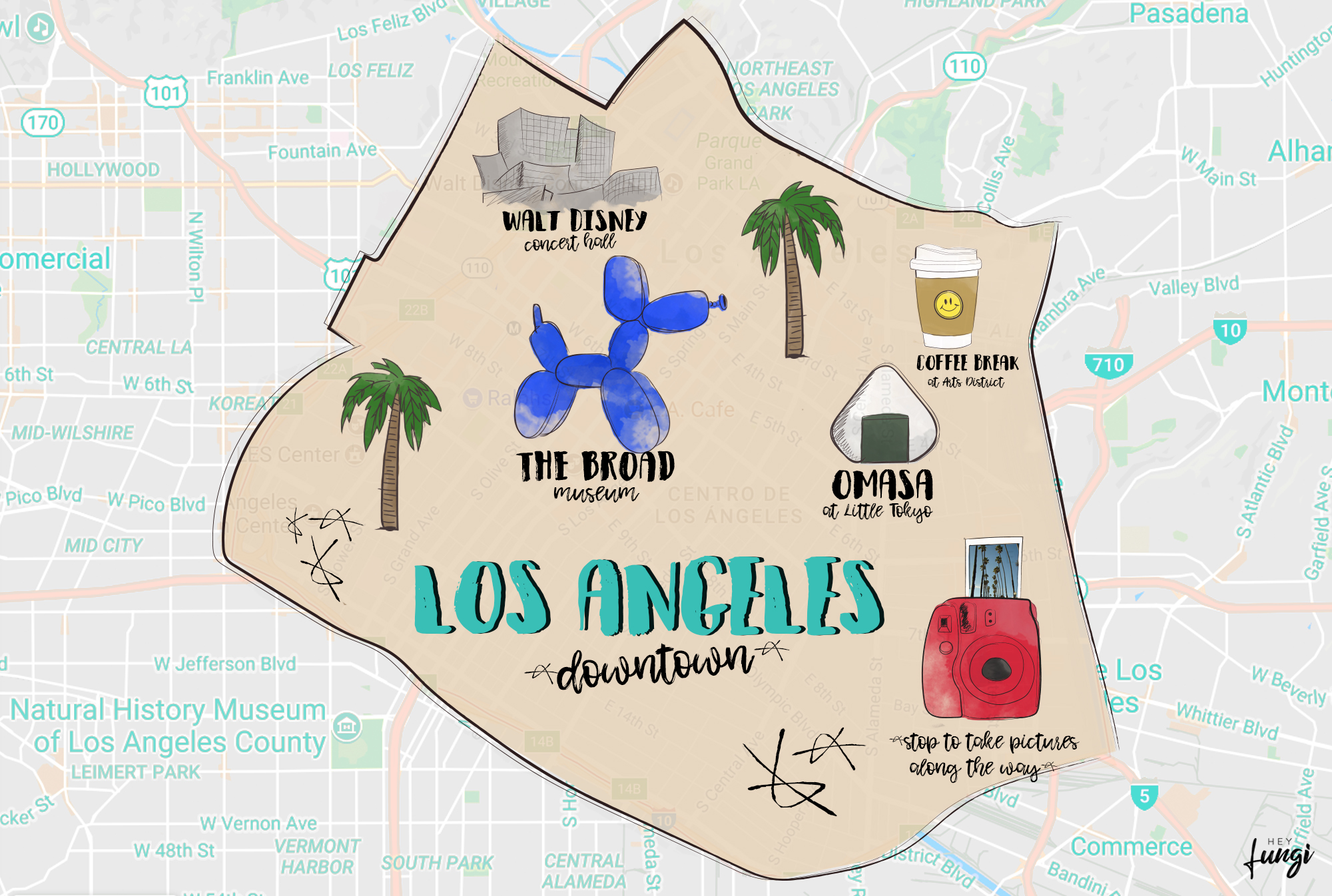 Haz la cola para entrar al Museo de Arte Contemporáneo The Broad (aunque si eres una persona prevenida y no como nosotros, puedes reservar tus entradas con un mes de anticipación en la web). Lleva tus gafas de sol y agua que el sol a esta hora carcome. Eso sí, la espera habrá valido la pena porque en el recinto encontrarás obras de Jeff Koons, Andy Warhol y Yayoi Kusama entre otros. ¿La mejor parte? ¡Es gratis!/ Wait in line to get into The Broad, a contemporary art museum (although if you are a prevented person and not like us, you can book your tickets a month in advance on the website). Bring your sunnies and some water ’cause the sun is burning at this time of the day. I promise waiting time will have been worth it once you get in. You’ll find pieces by Jeff Koons, Andy Warhol and Yayoi Kusama among others. The best part? It’s free!