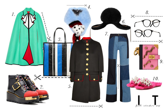 1. GUCCI cap / 2. PRADA platform boots / 3. BALENCIAGA shopper bag / 4. FENDI fur stole / 5. BURBERRY coat / 6. LOUIS VUITTON chapka hat / 7. VICTORIA BECKHAM patchwork jeans / 8. WILLOW SMITH x CHANEL eyewear / 9. PRADA charm / 10. MIU MIU slippers